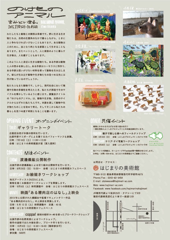 私たち人もまた動物です。しかし、現代社会において環境や生物の多様性を考えたとき、私たちが原因でそのサイクルを脅かしているように感じます。展覧会タイトルの「のけものアニマル」は、動物や生き物、自然のサイクルからはずれた私たち人です。本展を通して動物や生き物たちのことを改めて考え、そしてそこから私たちの暮らしを見つめ直す時間となることを願います。