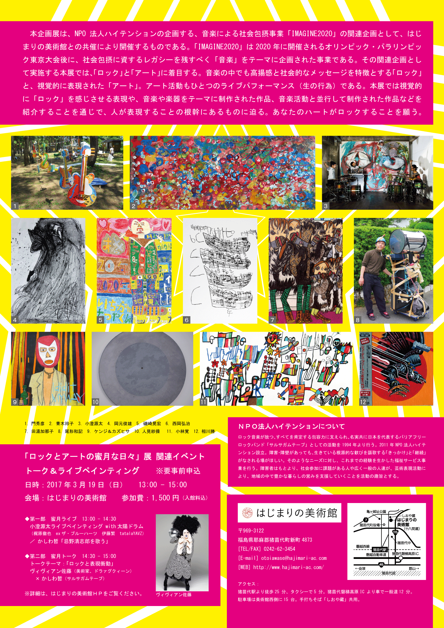 本企画展は、NPO法人ハイテンションの企画する、音楽による社会包摂事業「IMAGINE2020」の関連企画として、はじまりの美術館との共催により開催するものである。「IMAGINE2020」は2020年に開催されるオリンピック・パラリンピック東京大会後に、社会包摂に資するレガシーを残すべく「音楽」をテーマに企画された事業である。その関連企画として実施する本展では、「ロック」と「アート」に着目する。音楽の中でも高揚感と社会的なメッセージを特徴とする「ロック」と、視覚的に表現された「アート」。アート活動もひとつのライブパフォーマンス(生の行為)である。本展では視覚的に「ロック」を感じさせる表現や、音楽や楽器をテーマに制作された作品、音楽活動と並行して制作された作品などを紹介することを通じで、人が表現することの根幹にあるものに迫る。あなたのハートがロックすることを願う。
