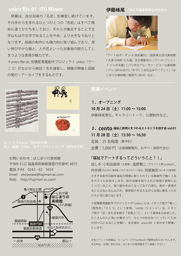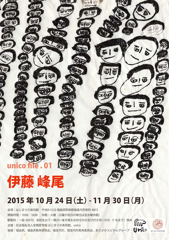 *unico file は、安積愛育園創作プロジェクトunico(ウーニコ)のなかから毎回1名を選抜し、個展の開催と図録の発行・アーカイブをするものです。