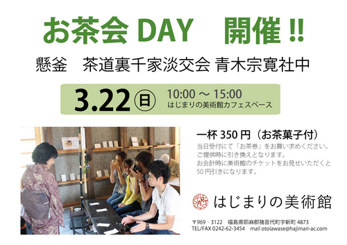 日時:2015年3月22日(日)10:00~15:00場所:はじまりの美術館カフェスペースお茶券:一杯350 円(お茶菓子付)