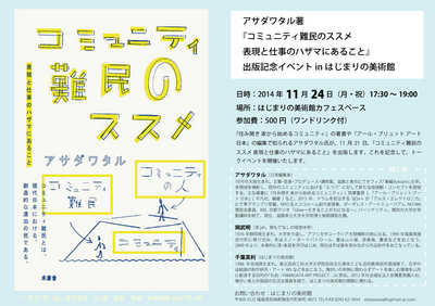 『住み開き 家から始めるコミュニティ』の著書や『アール・ブリュット アート日本』の編集で知られるアサダワタル氏が、11 月21 日、『コミュニティ難民のススメ 表現と仕事のハザマにあること』を出版します。これを記念して、トークイベントを開催いたします。