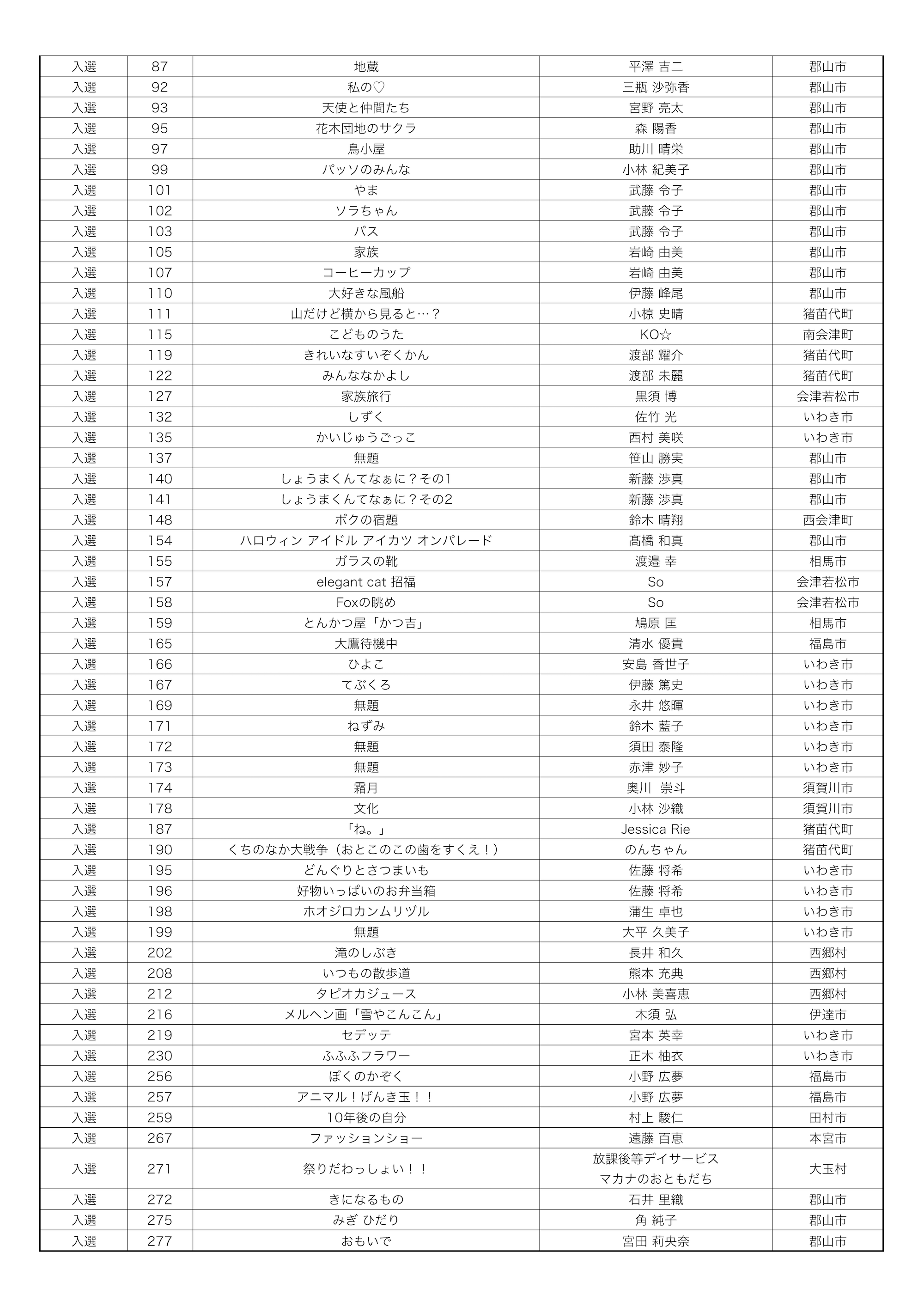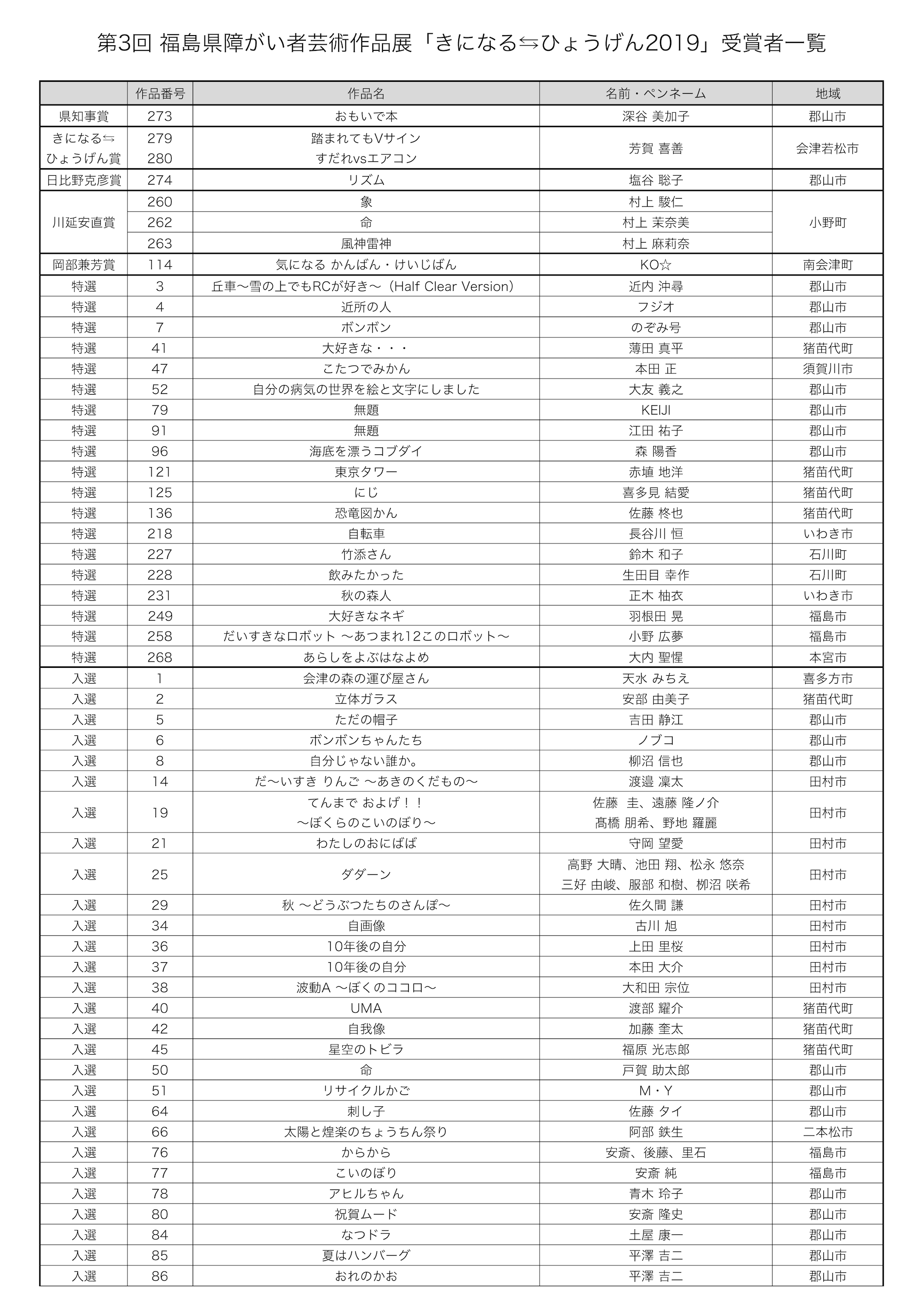 特選の作品は以下になります。 ※順不同・敬称略