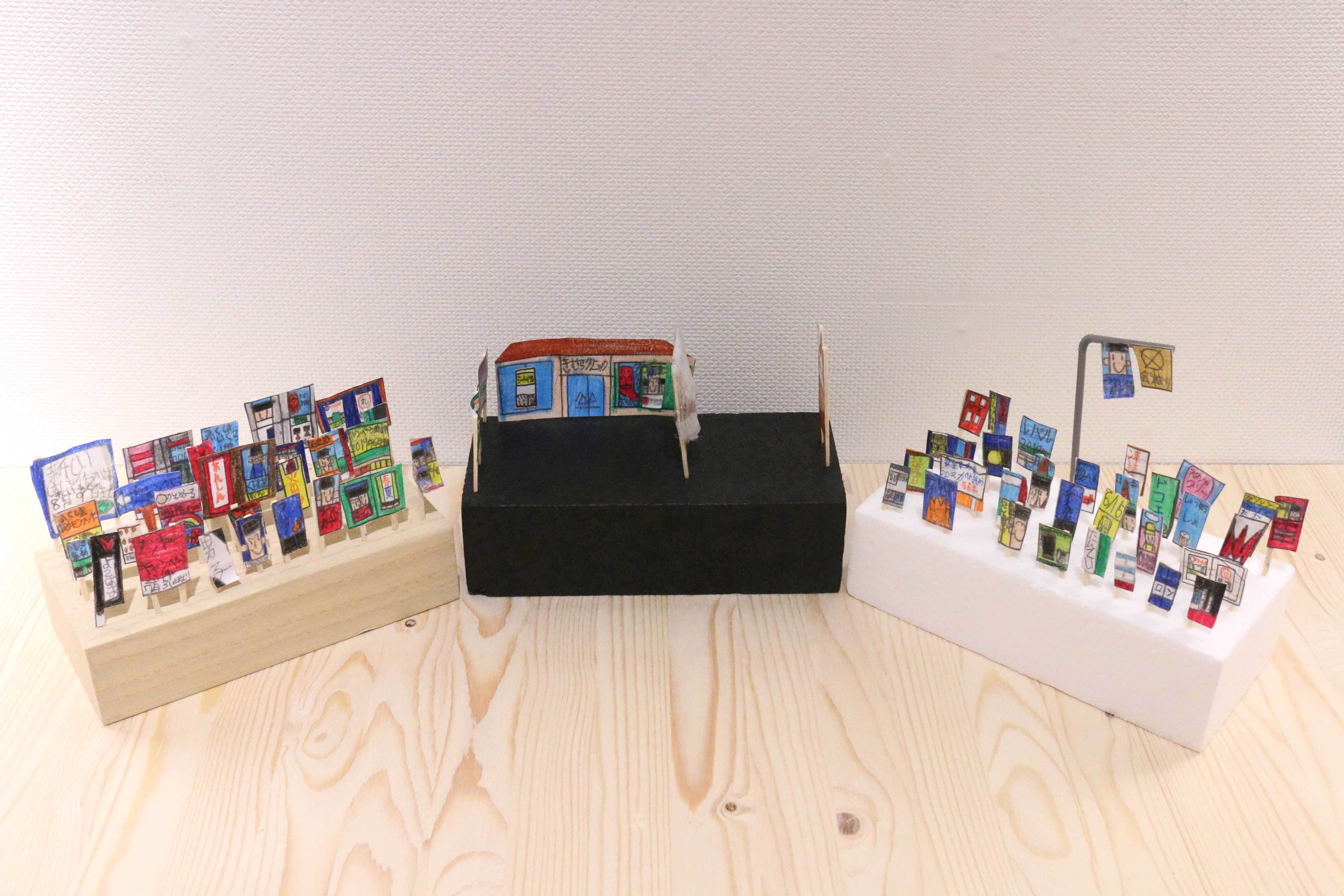 本作は、看板がびっしり立て込んである作品である。KO☆さんは去年も作品を応募され、そのときはスケッチブックに、KO☆さんが車のなかから見た風景がたくさん描かれていた。そのスケッチブックがたくさんあったなかに、本作にも似た雰囲気を感じるものがあった。今年は、そのなかでも看板だけが抜き出されていて、なんでこんな風に貼ったんだろうと気になった。お母さんのコメントにも、このきになる⇆ひょうげん展が、KO☆さんの目標になっているという言葉もあり、お母さんとも一緒に考えながら作ったりしたのだろうかと、2人の関係も見えてくるような作品。見れば見るほどいろんなことが気になる作品である。